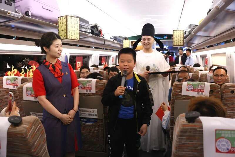 在“太白对诗”互动环节,西安客运段工作人员杨凌霄扮演的“诗仙李白”提问与列车途经城市相关的诗句,旅客踊跃接句,答对的小朋友赢得全场掌声。
