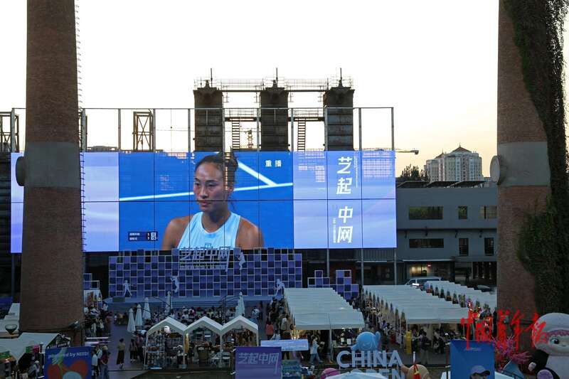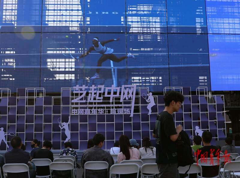 10月2日,北京798·751艺术园区动力广场,户外大屏正在直播当天进行的中网女单四分之一决赛,美国选手高芙迎战德国选手利斯的画面,吸引了不少年轻人在此围观。据介绍,国庆中秋长假期间,一场关于中网主题的嘉年华在这里举行,活动集合赛事直播、网球体验、艺术展演、潮流市集等,为市民带来一场“体育+艺术+消费”的复合型节日体验。中青报·中青网记者 陈剑/摄