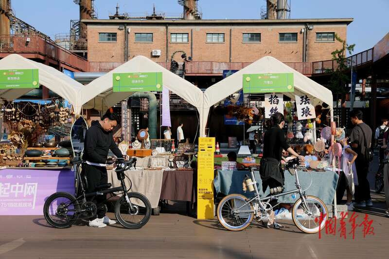 10月2日,北京798·751艺术园区动力广场,两位年轻推着自行车逛潮流市集。中青报·中青网记者 陈剑/摄