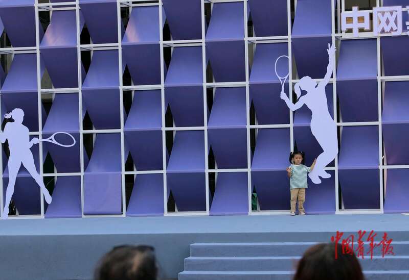 10月2日,北京798·751艺术园区动力广场,一位小朋友和网球运动员的剪影图案合影。中青报·中青网记者 陈剑/摄