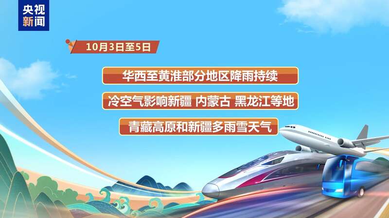 据中央气象台发布的消息,10月3日至5日,华西至黄淮一带部分地区降雨持续,冷空气影响我国新疆、内蒙古、黑龙江等地,青藏高原和新疆多雨雪天气。公安部交通管理局提醒广大驾驶人和出行群众,注意关注沿途及目的地气象部门预报预警信息。