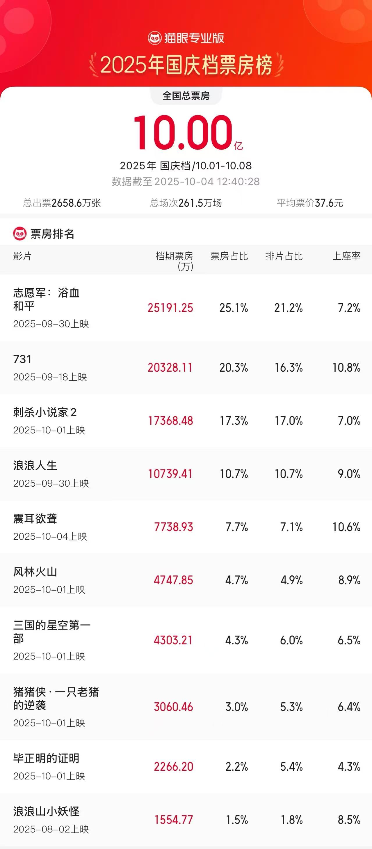据网络平台数据,截至10月4日12时40分,2025年国庆档档期票房破10亿,《志愿军:浴血和平》《731》《刺杀小说家2》分列前三位。