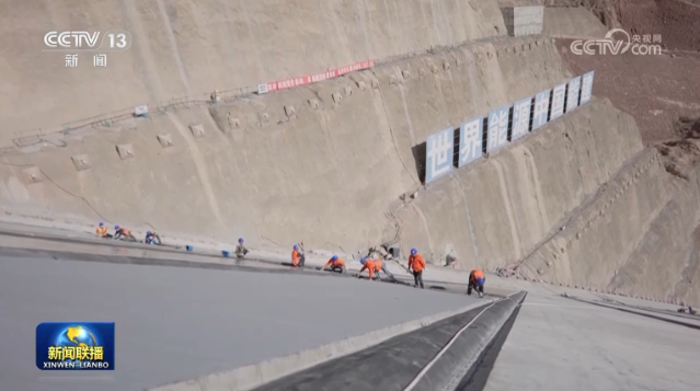 新疆大石峡水利枢纽工程现场,工人们在相当于80层楼高的混凝土石坝上作业。这项民生工程建成后,年生产清洁电能可满足65万户家庭一年的用电需求。