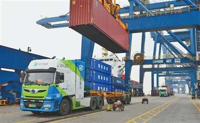 浙江嘉兴立足氢能源领域资源优势,持续拓展氢能示范“应用链”。图为嘉兴港乍浦港区,氢能重卡在集装箱码头运输作业。
