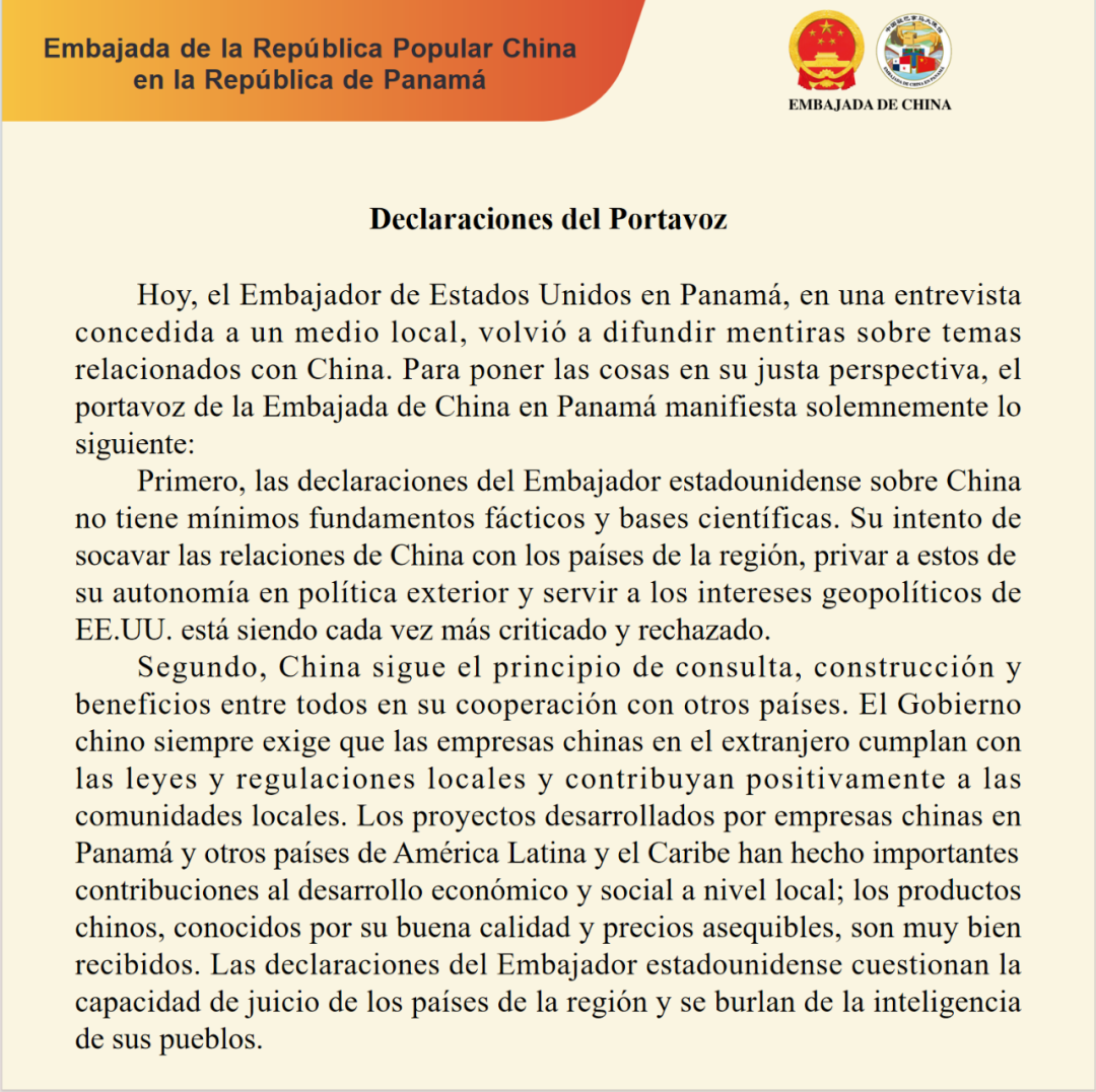10月6日,中国驻巴拿马大使馆发布声明:今天,美国驻巴拿马大使在接受当地媒体采访时又一次就涉华问题散布谎言。为以正视听,中国驻巴拿马使馆发言人严正声明如下: