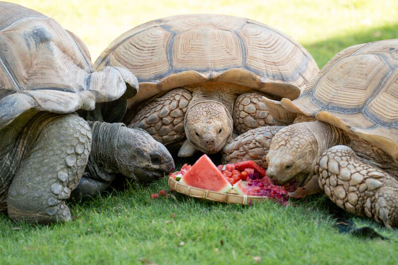 亚达伯拉象龟(左一)和苏卡达陆龟(右二)享用水果月饼。受访者供图