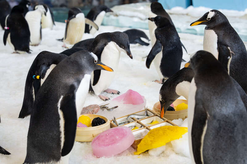这个中秋,动物月饼花样繁多,馅料却都是动物们的日常食谱,质和量都经过了严格的把控。如企鹅大家族收到了“冰皮”海鲜月饼。保育员用处理好的磷虾、多春鱼、小鲱鱼做馅料,再加水填满模具,将其放入零下十八九摄氏度的大冷柜中冰冻成型,月饼就新鲜出炉了。鲸鲨的月饼是纯磷虾馅的,月饼直径约30公分,重达3斤,大磷虾和小磷虾馅料被压得实实的,月饼上的花纹清晰可见。