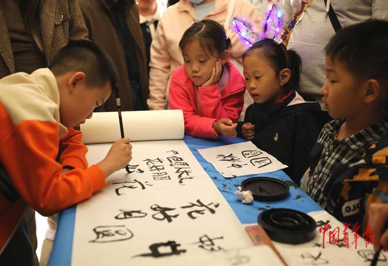 10月6日,北京月坛公园,小朋友在写关于中秋诗句的书法。中青报·中青网记者 陈剑/摄