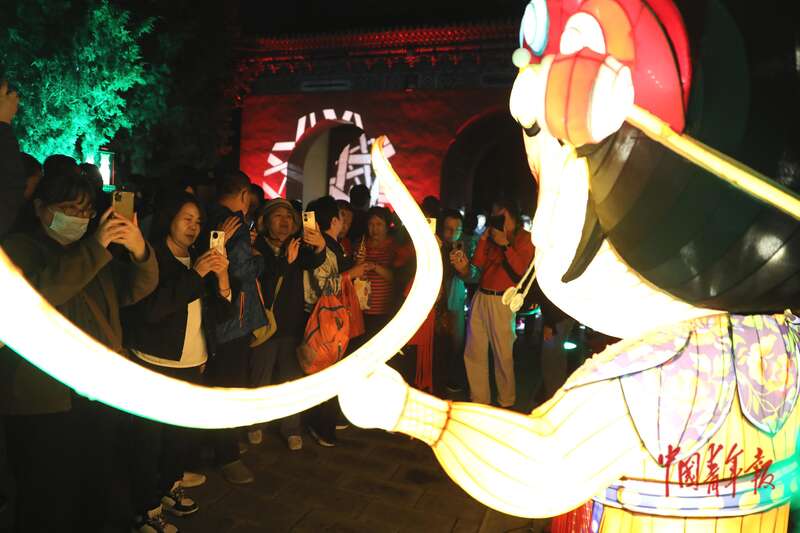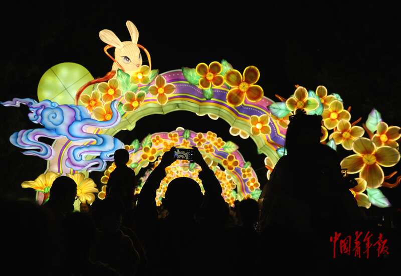 10月6日,北京月坛公园,市民在一处中秋花灯前驻足拍摄。中青报·中青网记者 陈剑/摄