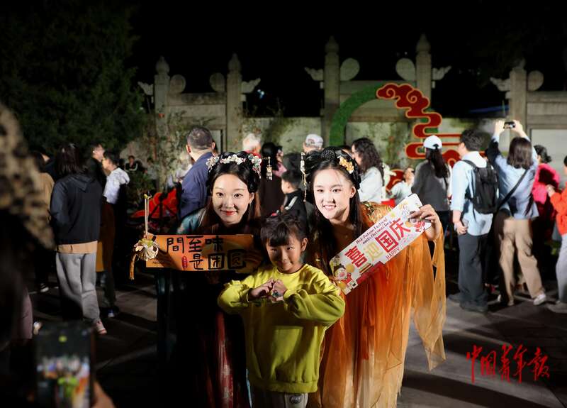 10月6日,北京月坛公园,一名小朋友与两个身穿华服的小姐姐合影留念。中青报·中青网记者 陈剑/摄