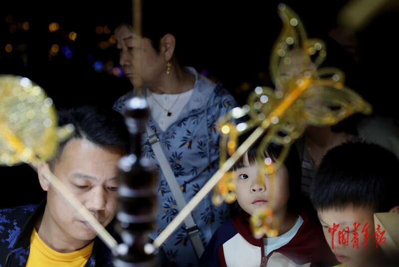 10月6日,北京月坛公园,一名小朋友骑在父亲的肩膀上伸手触摸头顶的花灯。当日正值中秋佳节,市民来到这里参与中秋游园活动,感受中华传统文化的魅力。中青报·中青网记者 陈剑/摄