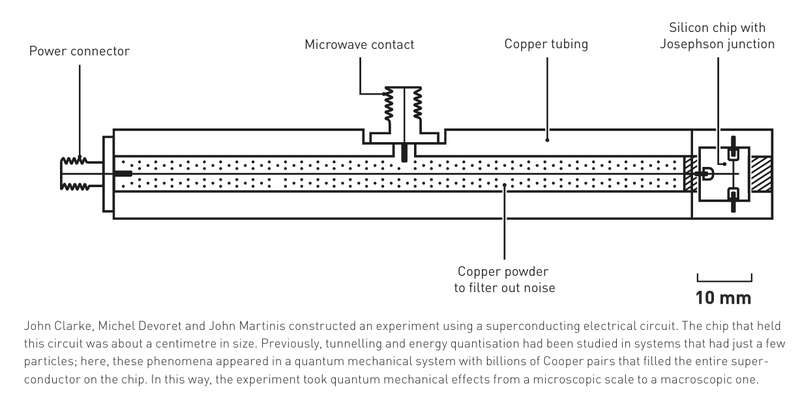 在量子力学数十年发展的理论与实验基础之上,1984年到1985年,约翰·克拉克、米歇尔·H·德沃雷和约翰·M·马丁尼斯携手,持续挑战在宏观尺度演示量子隧穿。