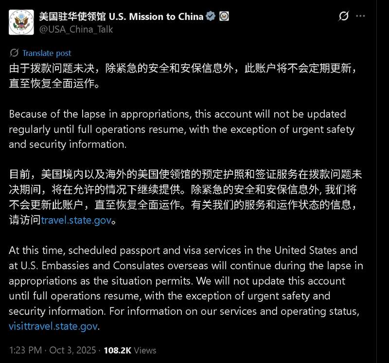 据环球时报此前报道,北京时间10月3日下午1时23分,美国驻华使领馆在美国社交平台X上的官方账号上宣布,由于拨款问题未解决,除紧急的安全和安保信息外,此账户将不会定期更新,直至恢复全面运作。