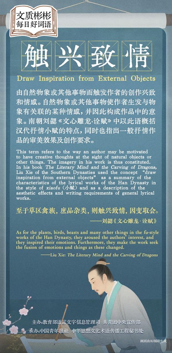 This term refers to the way an author may be motivated to have creative thoughts at the sight of natural objects or other things. The imagery in his work is thus constituted. In his book The Literary Mind and the Carving of Dragons, Liu Xie of the Southern Dynasties used the concept "draw inspiration from external objects" as a summary of the characteristics of the lyrical works of the Han Dynasty in the style of xiaofu and as a description of the aesthetic effects and writing requirements of general lyrical works.