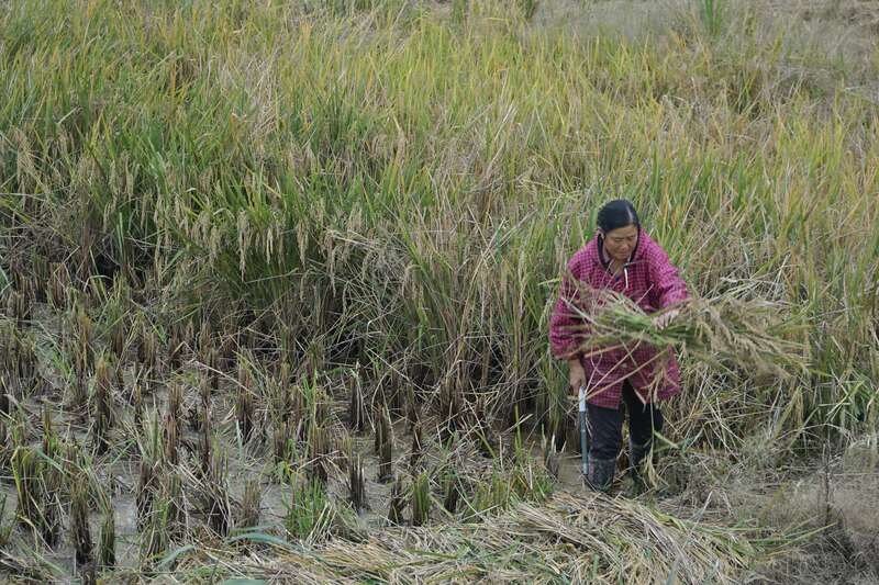 10月10日,河南桐柏,一名农妇正穿着雨靴、拿着镰刀,收割水稻。附近的其他地块,都被收割机割掉了,但这块稻田积水较多,收割机师傅担心陷车,并未机械收割。中青报·中青网记者 李强/摄