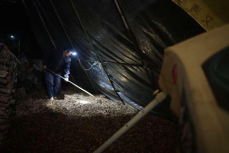 10月12日,河南桐柏,夜里又下起雨,一位农民在院墙外搭起棚子,晾刚挖回来的花生,有的花生已经发芽。中青报·中青网记者 李强/摄