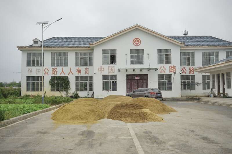 10月12日,河南桐柏,一家单位门前的停车场,临时被用来堆放稻谷晾晒。由于连阴雨天气,近期收割的稻谷水分很大,需要晾晒或烘干。许多地方都在通过开放公共场地、协调烘干设备满负荷运转等方式,确保秋粮晾晒烘干需求得到保障,全力以赴打好秋粮“保卫战”。中青报·中青网记者 李强/摄