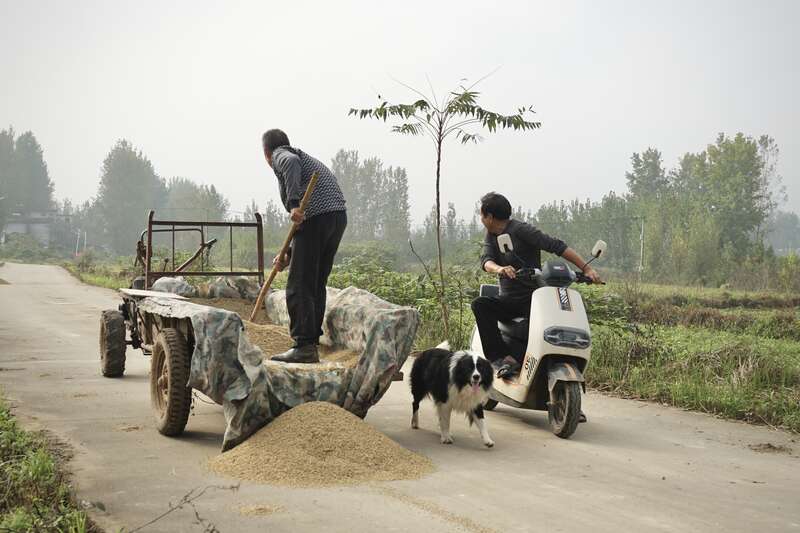 10月14日,河南桐柏,趁着太阳出来,一位农民赶忙把收割回来的湿稻谷,拉到村子附近的水泥路上晾晒。只要天不下雨,就有农民在路上晾晒稻子。中青报·中青网记者 李强/摄