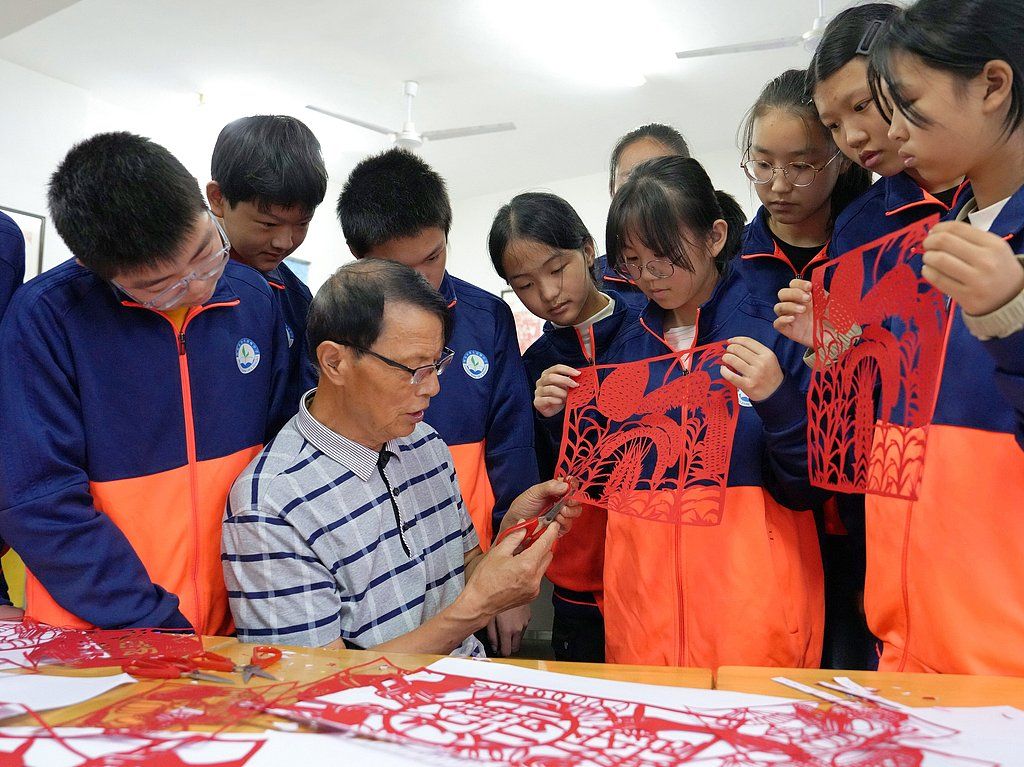 2025年10月15日,江苏省海安市墩头镇初级中学学生在老师指导下,创作以“世界粮食日”为主题的剪纸作品,在潜移默化中增强爱惜和节约粮食的意识。