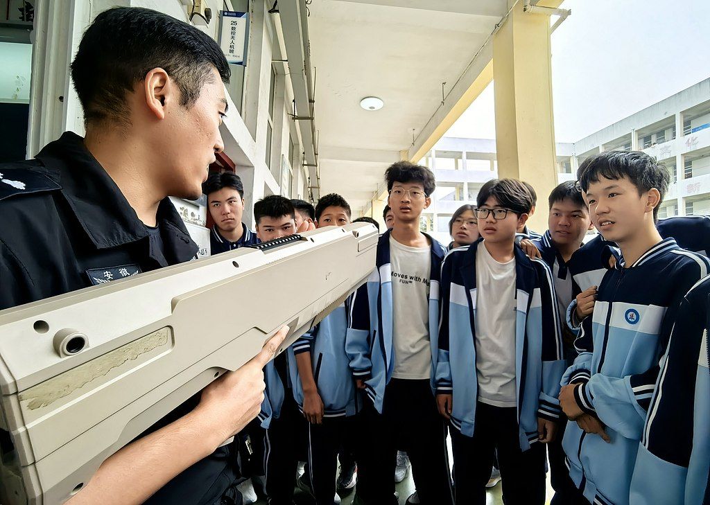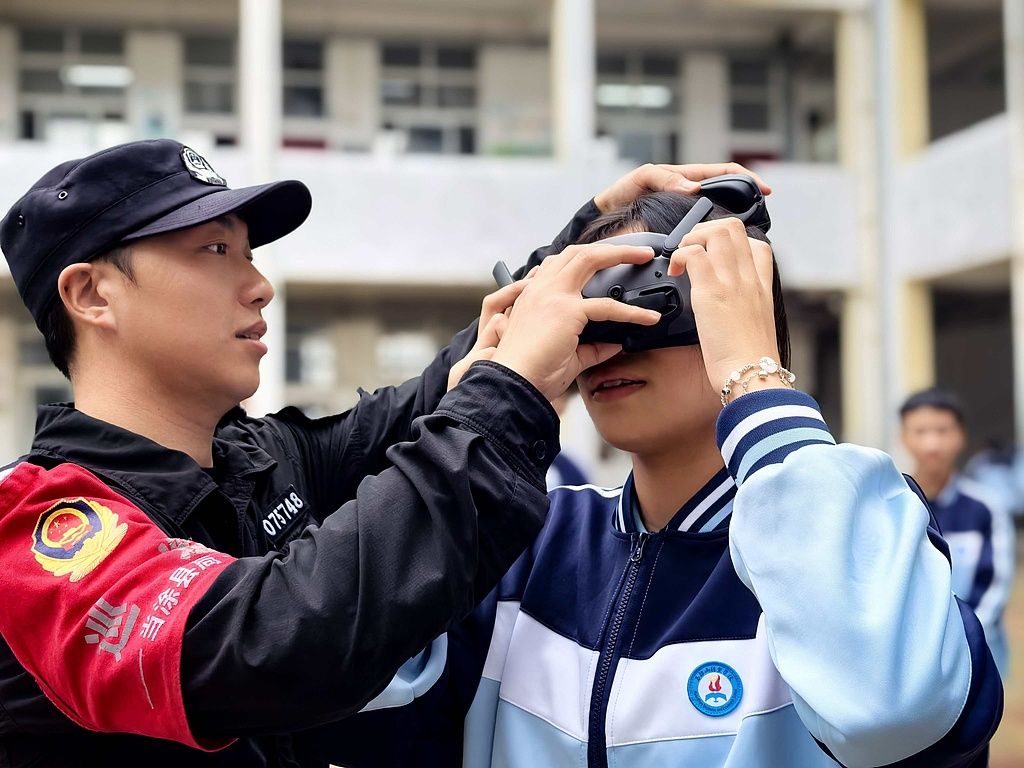 2025年10月15日,安徽马鞍山,当涂县公安局特巡警大队警航中队特巡警走进当涂县经贸学校无人机专业班,为学生带来低空经济实践课。