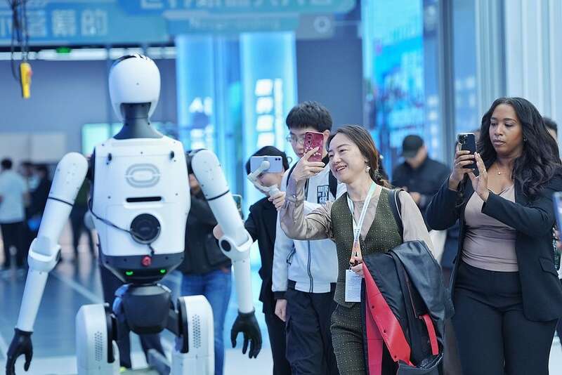 On October 14, 2025, some participants of the Global Leaders' Meeting on Women visited Beijing World of Robots. (Photo by China News Service)