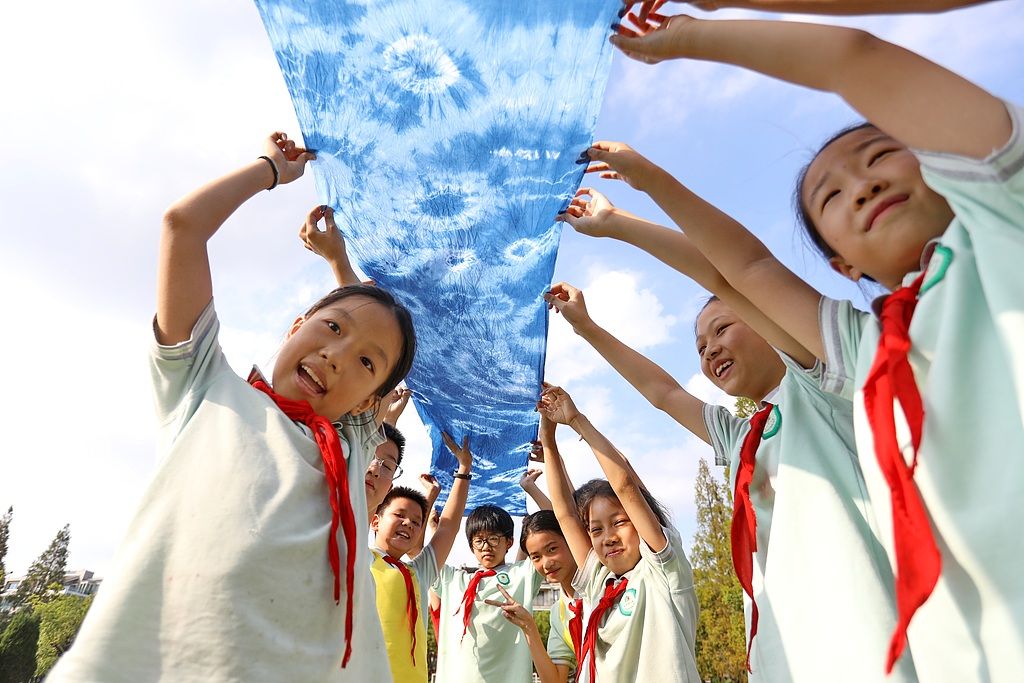 2025年10月17日,在浙江省嘉兴市三水湾小学,学生们展示亲手制作的非遗技艺扎染。 近年来,浙江省嘉兴市三水湾小学大力开展“非遗进校园”综合实践活动,非遗扎染、蛋壳画、农民画、灯彩等一大批非遗技艺走进课堂,让学生们在实践中感受非遗魅力,陶冶情操,增强文化自信。