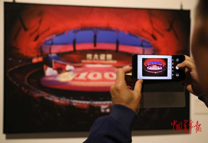 10月18日,北京中华世纪坛,北京国际摄影周2025之“中国新闻摄影精品巡展”展览现场,一位参观者用手机拍摄关于庆祝中国共产党成立100周年文艺演出的图片。中青报·中青网记者 陈剑/摄