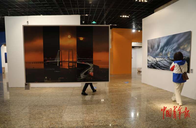 10月18日,北京中华世纪坛,北京国际摄影周2025之“佳能CPS会员摄影展”展览现场,现场展示反映广东深中通道在不同时间段图景的5张拼接画面。中青报·中青网记者 陈剑/摄