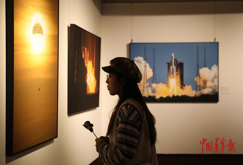 10月18日,北京中华世纪坛,北京国际摄影周2025之“中国新闻摄影精品巡展”展览现场,一位参观者驻足观看反映我国航天事业发展的图片。中青报·中青网记者 陈剑/摄