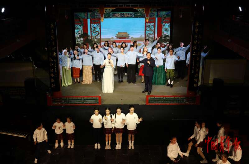 10月26日,北京正乙祠戏楼,“京韵留学生”合唱团(台上)和中轴晨光童声合唱团(台下)的团员们,在戏曲老师的带领下,共同演唱歌曲《家在中轴最美处》。今年北京市教委主办、中国戏曲学院承办了国际学生国情教育项目暨2025“留学北京·情系中轴”国际学生戏曲工作坊,工作坊共举办了5期,吸引了来自55个国家的100多名学生参与,共同体验唱念做打。除了戏曲工作坊,还有其他6所北京高校也承办了以中轴文化为主题的国际学生国情教育项目,组织了合唱、舞蹈、摄影、骑行、古建游学等丰富的活动。中青报·中青网记者 陈剑/摄