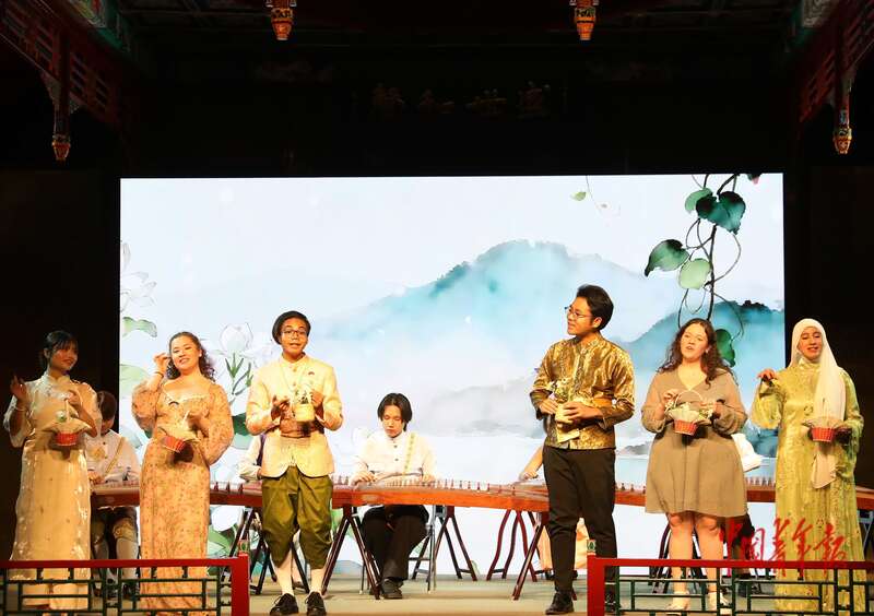 10月26日,北京正乙祠戏楼,来自北京语言大学艺术学院国际学生艺术团的团员们伴着乐器合奏演唱中国民歌《茉莉花》。中青报·中青网记者 陈剑/摄