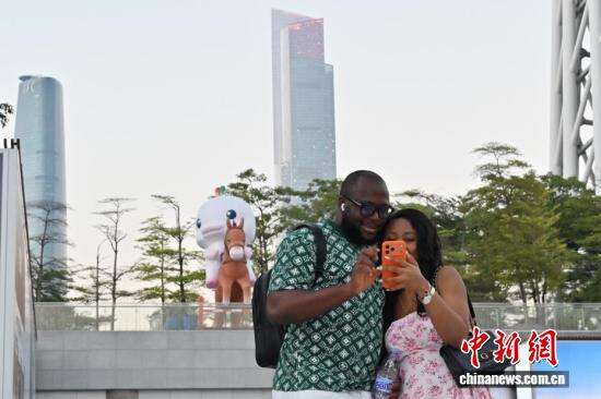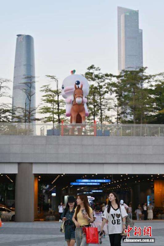 10月26日,广州市海珠区广州塔财富码头的十五运会和残特奥会吉祥物“喜洋洋”吸引游客拍照。