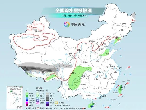 今天(10月27日),冷空气继续影响我国,降温区域主要集中在东北一带,其他大部地区将开启升温模式,气温陆续回归常年同期平均水平,29日前后南方多地最高气温可升至25℃以上,但月底还将有一股冷空气来袭,需保持关注。明天起,青藏高原一带雨雪天气增强,局地或现大暴雪,当地需加强防范。