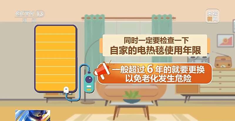 需要留意的是,不要把电热毯放在金属物或尖、硬物上使用,以免造成破损,导致线路短路。同时一定要检查一下自家的电热毯使用年限,一般超过6年的就要更换,以免老化发生危险。
