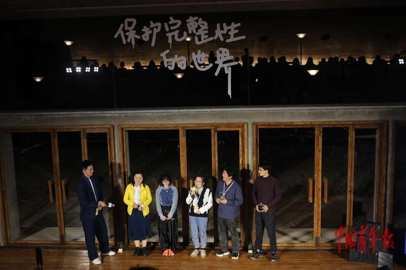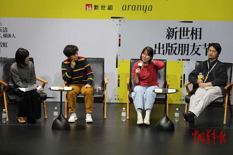 10月26日,河北秦皇岛蜂巢剧场,媒体人郭玉洁(左二)、马来西亚作家林雪虹(右二)、新晋小说作家刘楚昕(右一)在“一种声音”主题论坛上交流他们如何在写作中感知生活的变化、回应当下的问题。中青报·中青网记者 孔斯琪/摄