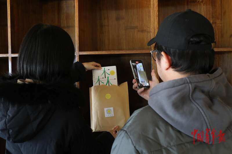 10月26日,河北秦皇岛孤独图书馆,一名读者正在录制“开盲盒”的瞬间。中青报·中青网记者 孔斯琪/摄