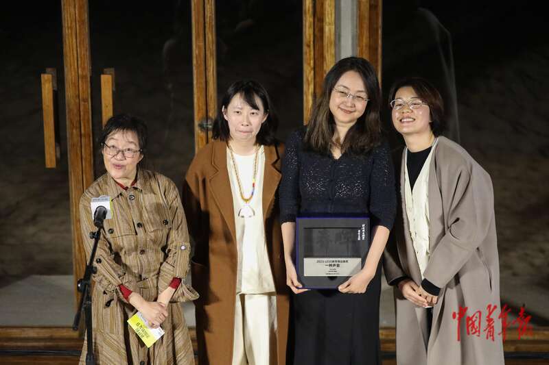 10月25日,河北秦皇岛孤独图书馆,当代诗人、作家余秀华(左一)为《春晖》一书颁奖。《春晖》是由漫画家、插画家、中国美术学院副教授阮筠庭(右二)所作的半自传漫画图书,记录了一位教师数载的变化与成长,用漫画这“一种声音”,回应自己职业生涯的困惑与人生的起伏。中青报·中青网记者 孔斯琪/摄