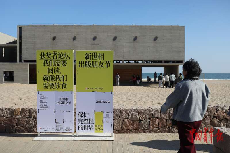 10月26日,河北秦皇岛孤独图书馆外,一名游客关注新世相出版奖获奖者论坛。中青报·中青网记者 孔斯琪/摄