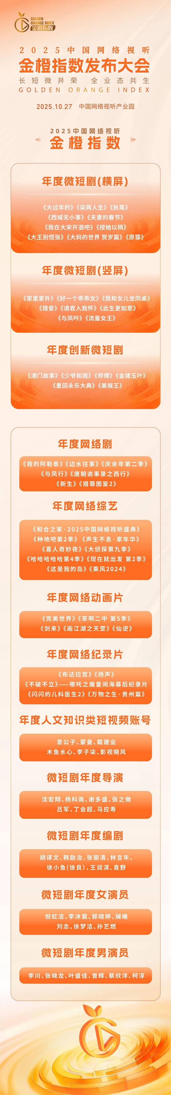 中国青年报客户端讯(中青报·中青网记者 沈杰群)10月27日,2025中国网络视听金橙指数发布大会在北京举行。会上发布了2025中国网络视听金橙指数年度微短剧、网络剧、网络综艺、网络纪录片、网络动画片、人文知识类短视频账号等各类作品和年度微短剧主创人员的评价结果。