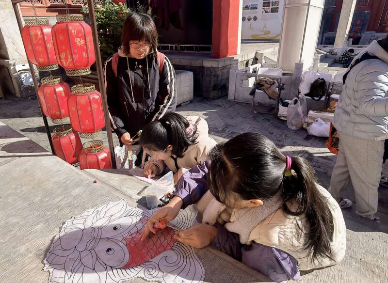 10月26日,北京什刹海,非遗市集上,小朋友们在学画京剧脸谱。当日一场来自北京与江苏镇江的非遗体验活动在这里举行,观众沉浸式领略两地非遗风采。当日正值周末,活动现场吸引了不少青少年前来参观和体验。李庚伟/摄