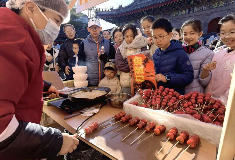 10月26日,北京什刹海,非遗市集上,小朋友们在观看北京冰糖葫芦的制作过程。李庚伟/摄