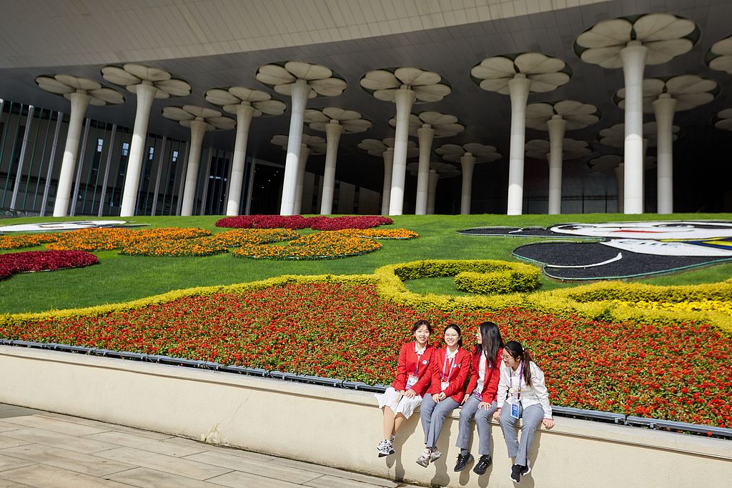 2025年11月3日,上海,进博会开幕前夕,志愿者在展馆前合影留念。