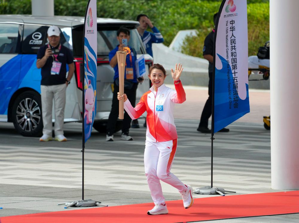 11月2日,火炬手佘缮妡在火炬传递中。当日,中华人民共和国第十五届运动会火炬传递香港站举行。新华社记者 朱炜 摄