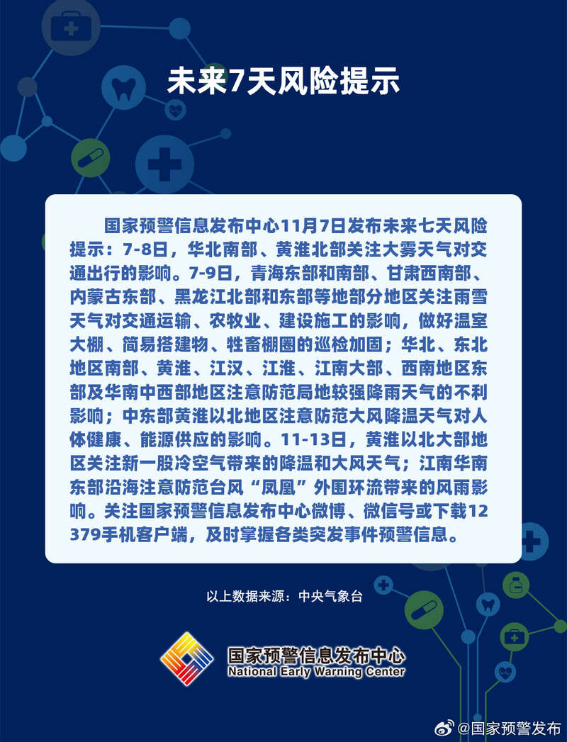国家预警信息发布中心11月7日发布未来七天风险提示: