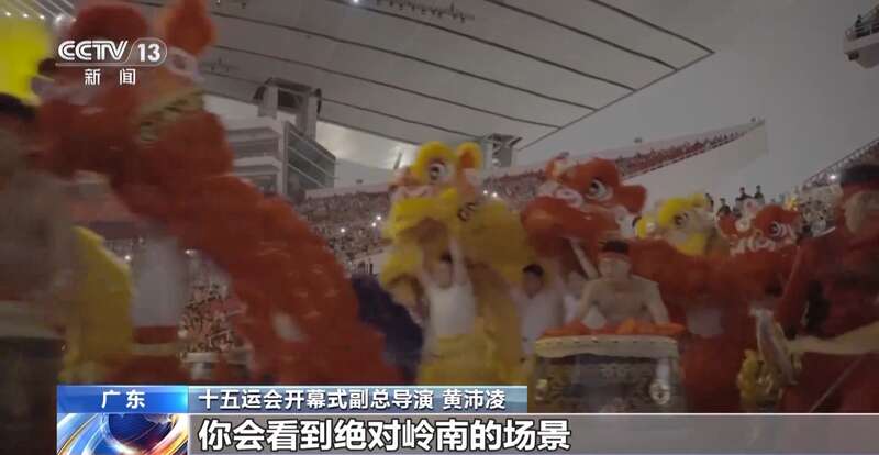 十五运会开幕式副总导演 黄沛凌:岭南元素作为我们的核心表达,你会看到绝对岭南的这个场景,岭南的花窗、芭蕉叶,包括灯笼等图案元素,希望通过既岭南又动感的场景来演绎整个内容。