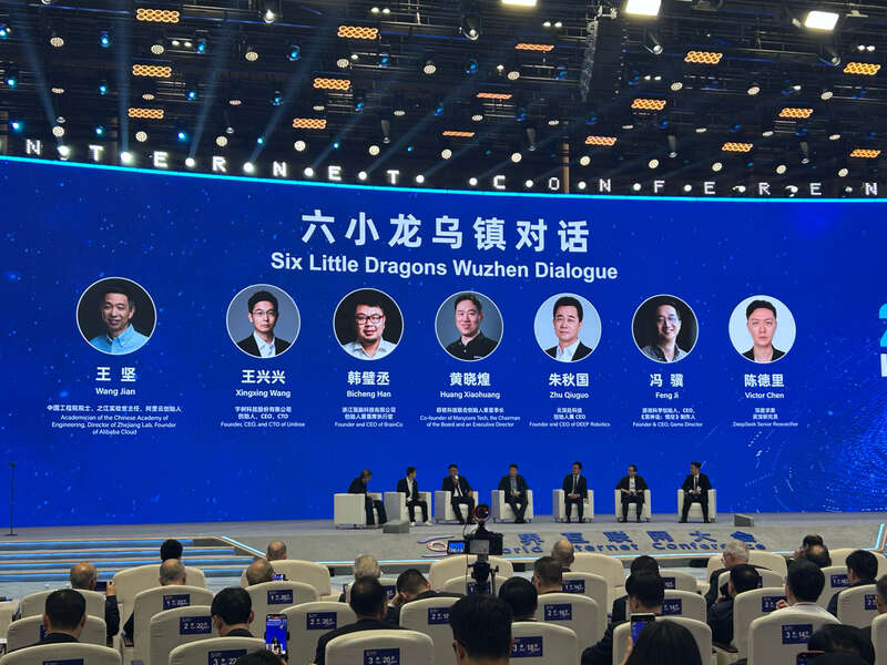 11月7日,在2025年世界互联网大会乌镇峰会主论坛上,宇树科技、群核科技、强脑科技、游戏科学、深度求索、云深处科技共6家“杭州六小龙”企业的负责人首次同台对话。中青报·中青网记者 贾骥业/摄