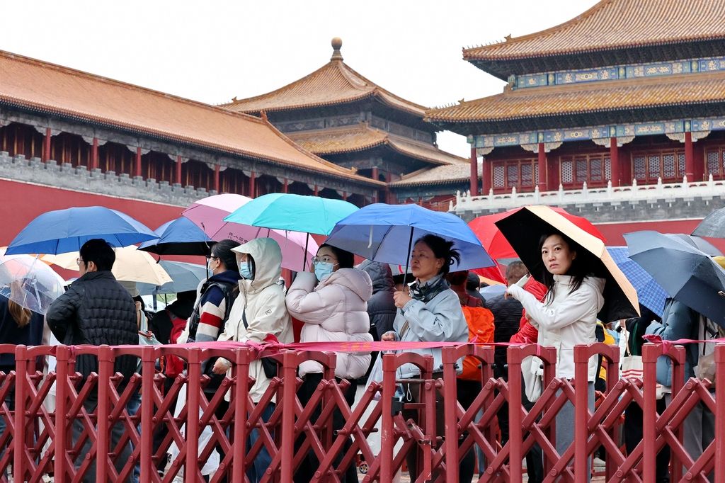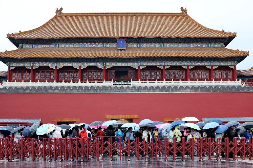 北京开启降雨降温模式 游客雨中逛故宫兴致不减