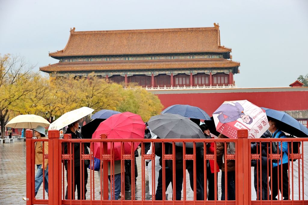 2025年11月7日,北京,立冬节气,北京开启降雨降温模式,游客冒雨游览故宫兴致不减。