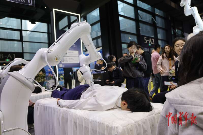 11月7日,浙江乌镇,“互联网之光”博览会,观众体验机器人推拿按摩。陈思阳/摄