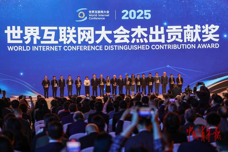 11月7日,浙江乌镇,在2025世界互联网大会乌镇峰会开幕式上,现场颁发了“世界互联网大会杰出贡献奖”。其中宇树科技、蚂蚁密算、理想汽车等共同获得成长潜力类奖项。陈思阳/摄